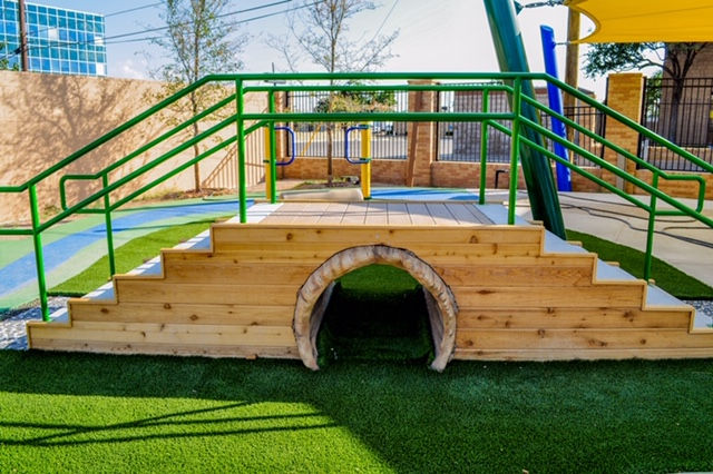 The outdoor therapy center of the PBRC is uniquely the only such facility of this scale in the nation. Serving patients ranging from toddlers to seniors, the design features numerous tactile, audio, and visual stimuli areas for a wide range of patient needs. The center utilizes a 1 to 1 patient/therapist relationship and serves a multi-county region of Texas. Unique LED phased lighting illuminates colorful shade canopies at night and creates a stunning site for downtown aesthetics as well as community gatherings.